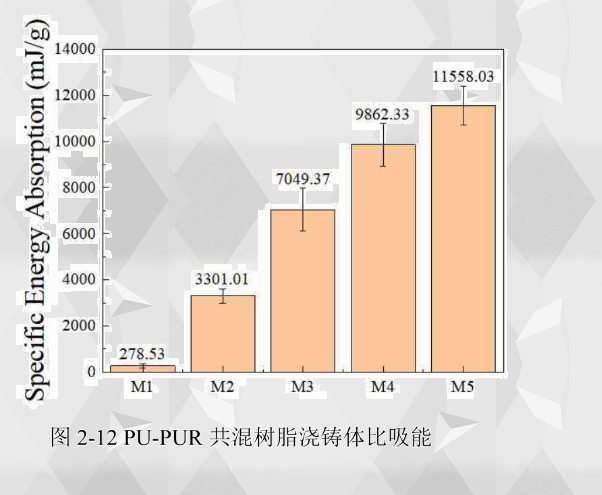 壓縮彈性模量表現材料在壓縮荷載作用下彈性變形的能力大小,反應出材料發生彈性變形的難易程度。從2-11(a)中得到,樹脂澆鑄體的壓縮彈性模量隨著聚脲組分的增 加而不斷增加,這和拉伸彈性模量的增加趨勢一致。M1聚氨酯的壓縮彈性模量數值較低,為4.83MPaM2樹脂澆鑄體的壓縮彈性模量為14.70MPa,相比聚氨酯增加了204.35%M3樹脂澆鑄體的壓縮彈性模量為34.03MPa,相比M2增加了131.50%M4樹脂澆鑄體的壓縮彈性模量為248.43MPa,相比M3增加了630.03%。可以看出,M3的壓縮彈性模量增幅很大,在聚脲所占比例達到50%后,彈性模量的提升更加明顯,說明此時聚脲成分在樹脂澆鑄體中占據主要作用,支撐起了材料的結構,使得樹脂澆鑄體抵抗彈性變形的能力得到極大增強。M5聚脲的壓縮彈性模量最高,為832.54MPa壓縮強度表示材料抵抗壓縮載荷而不失效的能力,在聚脲組分占混合樹脂的比例不斷增加的過程中,材料的塑性特征越來越明顯,其壓縮強度也不斷增強。從2-11(b)中得到M1聚氨酯的壓縮強度較低,為1.71MPaM2樹脂澆鑄體的壓縮強度為13.31MPa,相比比聚氨酯增加了678.36%M3樹脂澆鑄體的壓縮強度為34.88MPa,相比M2增加了162.06%M4的壓縮強度為42.65MPa,相比M3增加了22.28%M5聚脲的壓縮強度為42.09MPa。可以看出,在聚脲所占比例在50%以下的時候,樹脂澆鑄體壓縮強度增加非常明顯,而聚脲所占比例在50%以上的時候,其壓縮強度增加有限,M3M4M5的壓縮強度較為接近且大于M1M2樹脂澆鑄體,M4M5壓縮強度最高且相差很小。